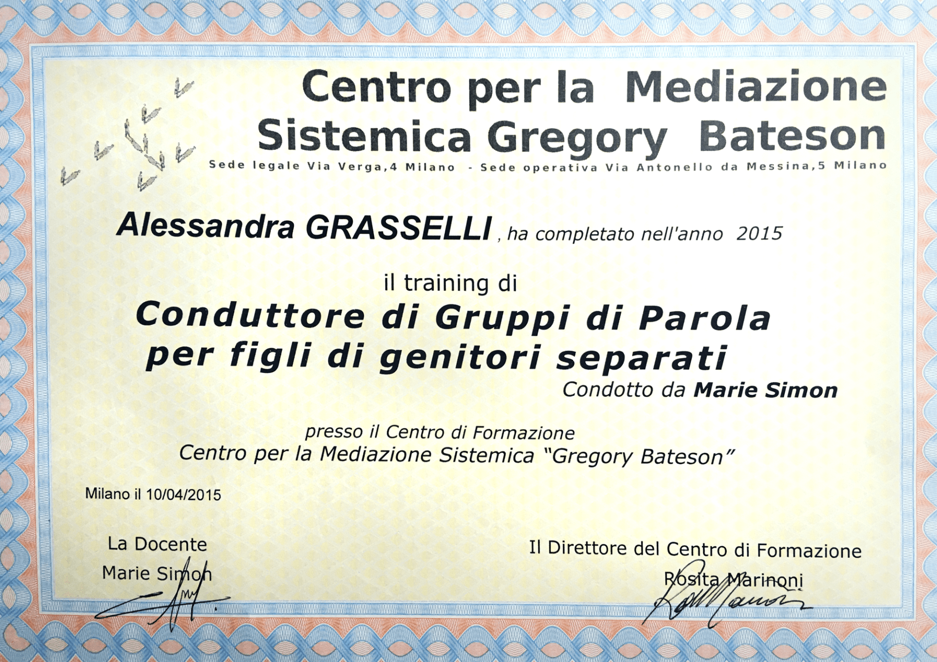 E’ mediatrice familiare; è conduttrice di gruppi di parola per bambini di genitori separati e/o divorziati.